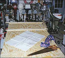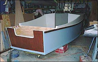 I purchased a set of plans (dirt-cheap @ $30.00) and began construction during the first week of October 2000, and launched for sea trials the second week of April 2001.  Not wanting to put too much money into my as yet unproven boat building skills, I elected to build "on the cheap". I used 5/8" BC pine exterior plywood for the bottom; 3/8" BC for the sides; 1/4" BC for the bulkheads, and 5.2 mm lauan for the cabin roofs.  As I was using thicker plywood for the sides and bottom than Jim recommends, and was using thinner stuff for the roof and bulkheads (to try to save some weight) I ended up using about 13 sheets of plywood. If you follow th plans, you can get by with nine sheets.