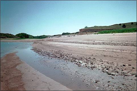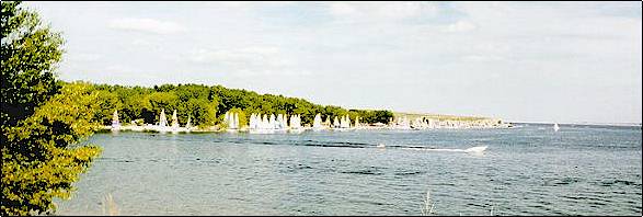 | You can see the far shore in the shot on the left. It's hard to believe that it's over three miles away, and look at the white sand beaches! At well over 20 miles long with many such inlets as this one, it's a perfect place to spend weekends. Unfortunately, the wind can be very unpredictable and with a boat like the Frolic2, you can find yourself miles from your boat ramp and no way to get back. With the natural lay of the lake being NW to SE, a 15 to 20 MPH wind can generate waves in excess of 3 feet high. Entirely too much for a boat such as our Frolic2. Besides, my wife and I are now in our mid 40's (don't mention I said that to her) and we just aren't into tent camping anymore and want a nice comfy bed with a hot shower in the morning. |