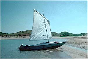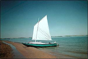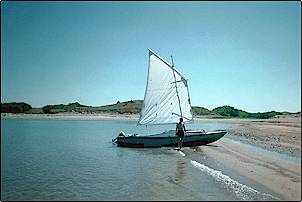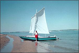 proceeded to tack into the inlet and managed to sail right onto the beach. The rudder and leeboard worked just as design by pivoting up gently as we landed. I had always wanted a picture of the boat beached with the sail up. As luck would have it, the wind calmed to nothing and we got our chance. |