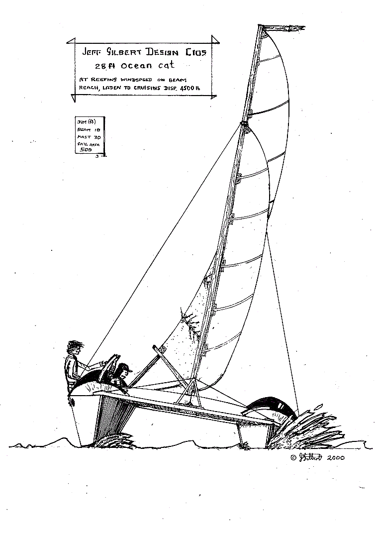 swept back shrouds to outer of hulls and forestay to front beam. Roachy fully battened