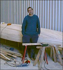 Photos show half hull planked waiting for the edge glue to cure (timber is