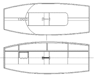 A sailboard rig is going to be a winner on looks and also efficiency, but everything else about this boat has got to look cool and be efficient too - in order to match that sail in the kids' minds, even the daggerboard and rudder have got to have a little 'something' about them. It also has to be a sit-on boat rather than a sit-in one. The basic dimensions close I have chosen are close to those of a couple of plastic mass-produced designs aimed at the young and intended for the same sort of purpose as here: I have selected a hull length of 11ft, beam of 4ft, and a 5.5square metre sail (about 59sq ft).