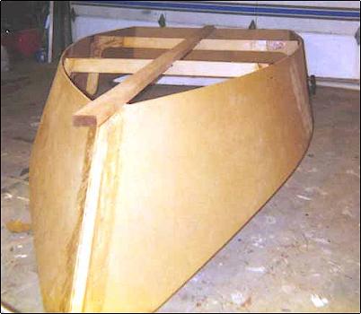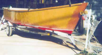 | Hi Chuck. The boys and I thought we'd send in an update of our skiff. We really enjoy viewing the work of the "PRO's" out there. WOW ! As you can see from the picture the boat is up on the trailer.