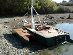 I know that now a long phase of tinkering with experimental sails and improving details begins. But the boat already meets my expectations completely, I only think it was too much work (estimated 400-500 hours). If I had to redo the design, I'd leave out the styrofoam double bottoms, which means having no self-draining cockpit and no self-draining stowage boxes. With the two floats and the sandwich platforms the boat is already unsinkable, and the only way to get water into the cockpit is by sailing in the rain.