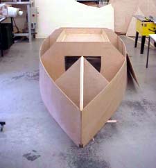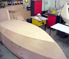 I bought the plywood and a used trailer in spring 2001. Unfortunately the trailer was a bit to short for the boat, but I thought I could get away with it if I shortened the boat to 4.70 m. At the same time, my wife stated clearly that she would not sleep in such a small boat, and thus the aft cabin became obsolete. I changed the design by doing two straight cuts through the given hull lines (my father had already made the stem and I didn't want to throw it away): I cut off the last 30 cm and the top structures.