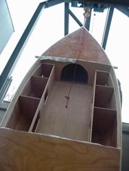 Since the hull is made from Okoume, we glassed almost every part of the surface (they say it rots really fast). Although I always used latex medical gloves, I finally got allergic against epoxy. My hands appeared like cauliflower and itched for two weeks! In March 2002, we had to get the boat out of the workshop, which was not easy since the workshop was in the basement. Here is how we did it: