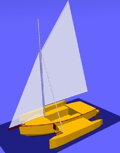 But what if you build something like a cruising centreboarder with stabilizing floats? It turned out that it would be feasible, but that a really light planing hull would require the cockpit to be more or less in the middle, since crew weight determines the location of the center of gravity to a high degree. On a short boat, there would be no way of getting a reasonably sized cabin in front of the cockpit since the first two feet are too narrow to be of any use. So I came to the idea of having an aft cabin and the resulting design looked like this: