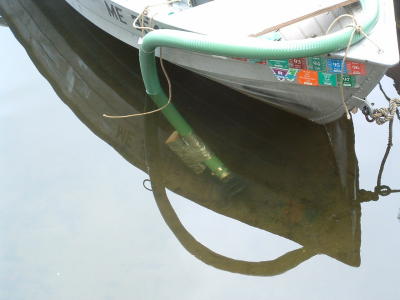 Another item to take care of was the pesky suction tube. Ideally we'd have a flush through-hull fitting with strainer but Candy had something against putting holes in her boat. So we elected to try to constrain the hose as much as possible to the side of the boat. A couple of rope-and-clamp schemes failed so we elected to duct tape a brick to the hose. Ever resourceful, Candy had a roll of 6" wide duct tape (eat your heart out Red-Green!).