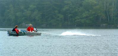 The photo below shows the jet pump and its accessories installed in Candy's 12 foot tin skiff. I was hoping that the Evinrude could be used for comparison and backup but I was informed that it hadn't worked all summer. The oars did work.