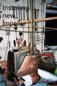 Slide the new impeller down the shaft and then the pump body down over it. Make sure the impeller has engaged it’s drive key. The easiest way to get the pump body down over the extended fins of the impeller, without causing the impeller to come off the drive key, is to gently push down on the pump body while manually turning the driveshaft in the direction of normal rotation (clockwise when looking down on the shaft.) the fins will fold back and the pump body will drop down until it is fully seated. Screw the pump body down and put the pin back in the top of the driveshaft.