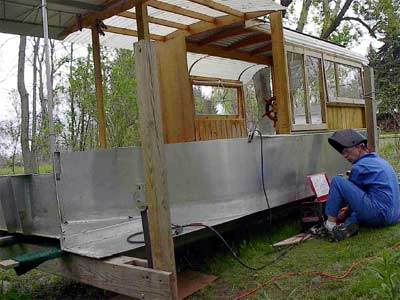 The design question I pondered all winter was how to add a more shapely bow. At first I considered removing the existing bow and replacing it with a new better shape but that required lengthening the boat and abandoning my current front. I could of course take the existing bow and use it as a stern by welding it to the existing transom but that would require extensive work on both ends. At this point it occurred to me that I had been looking at this problem backwards ! Why not look at the current bow as a shapely stern and rebuild the boat backwards.