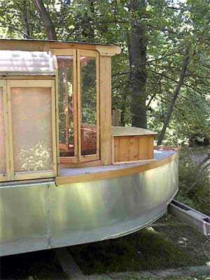 The deck /pilot house is constructed from the cedar removed from the boat and all exterior wood surfaces are stained with Cuprinol in the same manner you would a house. Brightwork is kept to a minimum since I leave this boat outside all winter in Buffalo, New York.