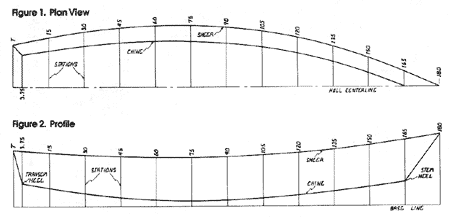 The first line drawn is the sheer line in plan view (see Figure 1). In Nemah's hull, the widest point is just aft of mid-length, and has a full- scale half-breadth of 25.8". At the transom, the half-breadth is 17.64". (Once down on paper, this line is definitive. Stations are layed out and half-breadths are taken off with an engineer's 1/50" scale to the nearest