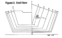 I generally develop my designs from three lines in two views: the sheer line in plan view (a top view of the hull), the sheer line in profile (the hull viewed from the side), and the chine line in profile. Because I derive all additional lines mathmatically, I normally do not draw an "end" view of the hull. Because an end view is needed to do this type of development without a calculator, I have included one in this article.