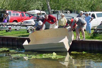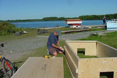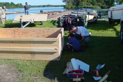 at the last minute. Here, Frank San Miguel & son caulk seams....