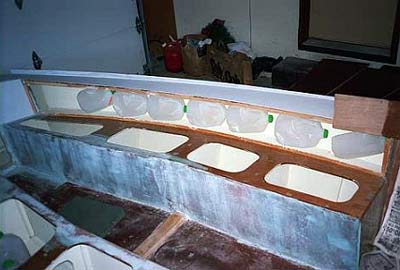 air chambers (sealed, empty milk jugs) behind the seat backs.