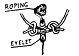 Many books and recommendations for lacing sails to spars refer to the use of a long continuous lacing, but there are two disadvantages to this. Firstly it is awkward to reeve, and secondly, if the lacing parts, then the whole length of the sail is loose. Such breakage invariably happens in rough conditions, and disturbs the set of the sail at a time when efficiency is desired by dire necessity. If separate lashings are used then both the above objections are removed. The breakage of one lashing is not anything like a disaster, and repairs may be effected at a more convenient moment than the throes of a squall. A reef knot is commonly used for the separate lashings, but a better way is suggested. A reef knot can fly loose when the weather is boisterous, and often has the ends flapping about. If two simple thumb knots are used, around the standing part, one on each side of the sail, they lock each other against the eyelet, and the ends may be short enough not to offend. There is nothing hanging below the spar, except one single turn of line.