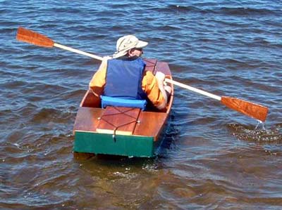 Since I am taller, I find it comfortable to brace against the forward bulkhead and use a boat cushion to sit on, keeping out of the pint or two of bilge water I deposit in the boat when I get in (have to remember a big sponge to get rid of that water next time). I have noticed that sitting on one boat cushion feels right and sitting on two boat cushions feels like I'm in danger of bringing my weight too high for safe buoyancy. I'm planning on playing around with a simple built-in seat. I have several styles to pick among in my library of boatbuilding books.