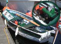'Snowdrop' was locally built, lapstrake cedar on oak, half a century ago. That's her original motor, a 1930s Briggs and Stratton. Note the side wheel steering - no room to swing a tiller with four people aboard.