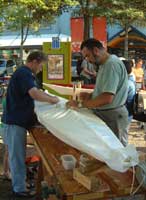At the 2003 festival Robert Morris (seen here on the right) could be found under the dappled shade helping folk to build the skin on frame boats described in his book. Under that fabric is an elegant skeletal frame, drawing its dimensions from the body of its owner instead of tapes and rulers.