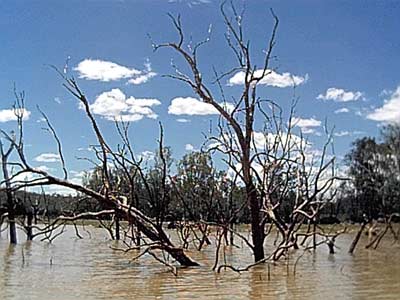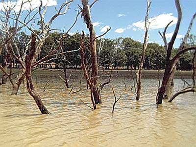 I've been paddling the Huntyak off and on for several months now and really like it, a very stable craft. I had it out on several trips so far as well as doing a few 4 km exercise sessions per week on the local lagoon. On the last trip I took the Huntyak out on Teresa Creek Dam [our local water supply reservoir] on a Sunday. I thought it might be good for my wife to get out with me on the water. The main area of the dam is about 1.5 to 2 km across but there are several feeder creeks coming into it and they go for several miles each. The water is a light brown colour, much like the mud was on the top instead of on the bottom. They reckon that the Dam will need to be flushed out several times before it comes clear again.