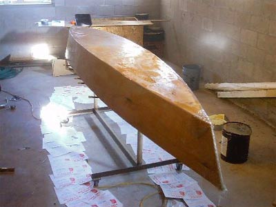 After `glassing the seams and laying down the first coat of epoxy, I glassed the bottom and the sides on the outside to protect them from rocks.