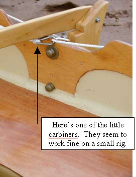 The sail is coupled to the spars using carbiners and PVC hoops. I used lightweight carbiners sold three to a pack from the golf section of Wal-Mart. I wasn’t sure how strong these would be. But, after several hours of sailing, none show any signs of damage whatsoever. They seem to be quite suitable for a small sail. The PVC hoops around the boom are 2 inches in diameter. The hoops around the mast are three inches in diameter so they easily fall over the low profile pin holding the two mast sections together. As long as the halyard is not twisted around the mast, the hoops fall quickly even when the sail is moderately loaded.