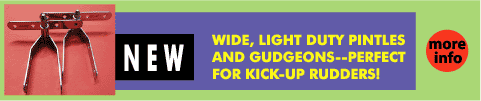 This shows the Hardware used to attach the rudder to the transom. Galvanized plumbing tees (astern), caps (inside the transom) and an interconnecting pipe section (not visible) attach to the transom itself. Washers are used to help distribute the load, but the bottom tee was attached too close to the seat to use a washer. Galvanized fence hinges are attached to the rudder. An eight inch long by half inch bolt holds it together. A PVC bushing is used inside the fence hinges, as their holes are just a little bigger in diameter than the holes in the tees. The hardware is painted gold.