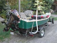 By 8:00 AM Wednesday morning both boats were on the water headed for the Prairie Portage. The sun was out and the wind was light from the southwest. The morning was very pretty and it looked as if things were starting to run smoothly again. However, fifteen minutes away from Island 5 we literally hit the last “bump”. I tilted the motor up and discovered Pescadora has lost her prop. This time the tow line was close at hand and we quickly tossed it to Harlan’s boat. It was slow going from that point to the Prairie Portage. As Pescadora was towed across Bailey Bay the wind had picked up enough that white caps were starting to form. Both Harlan and I were very happy that we had gotten the early start. The thought of towing Pescadora with a big following swell was a very unpleasant one. Once we were inside Inlet Bay the rest of the trip was in the lee or at least in somewhat protected water. I rowed onto the trailer at the Prairie Portage, and at the other side Harlan and I changed boats to give him a break from towing.
