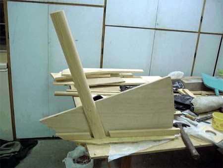 Roll her back to her feet. Install the fore and aft bulkheads at the ends of the ballast plate (which serves as nailer along the lower edge. Send the partner who’s best with a hammer forward as the up-curving bottom will crowd your swing.
