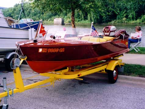 A nicely restored molded plywood Yellow Jacket boat on a restored