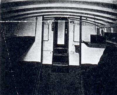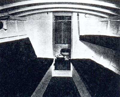 their hinged spring backs, make up into upper and lower berths for four people. On the port side aft is located the galley which