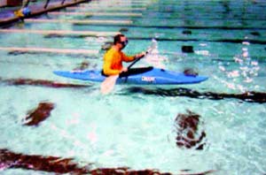 Our next challenge was to learn the “hip flick”, a swift sideways thrust of the hips designed to rock hull and paddler back to a vertical position. Practicing first on the side of the pool, we soon graduated to pushing off an instructor’s hands or a floating life jacket. By the end of the first hour, the pool had become a soggy chorus line of hip-flicking, aquatic belly-dancers.