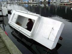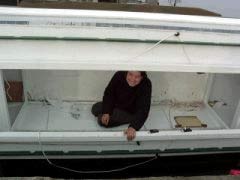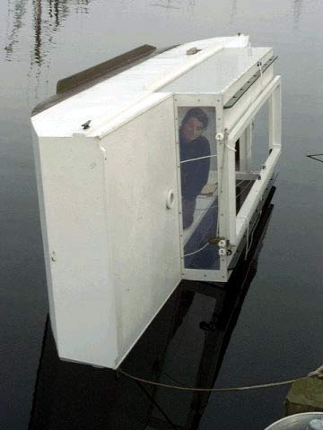 This might be a good time to mention the accommodations. Trilobyte 16 has a roughly 8 ft x 4 ft cabin with 3 ft 4 in headroom under the decks, and large, open bays at either end. About the same floor as a pup-tent with generous vestibules, but much greater volume. The windows ‘open out’ the walls for a spacious feeling and the sole is cushioned and carpeted for ease on the knees.