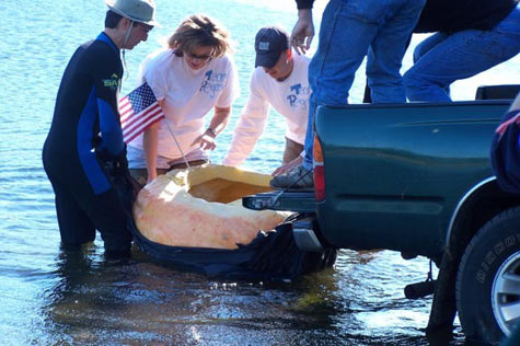 Aided by his lifting team, dubbed ‘Team Pegasus’, Fitzgerald transported the pumpkin to a local fair on Labor Day weekend garnering 4th place in the giant pumpkin contest. The day before the scheduled voyage, Fitzgerald spent three hours scooping out 200 pounds of pumpkin guts for a seating compartment, leaving walls about two inches thick – the amount an engineer had told him would create enough displacement to float his boat. The thinner the shell the more streamlined the watercraft he claimed. The next morning, Team Pegasus was busy again transporting the behemoth, this time to the boat ramp at a local pond.
