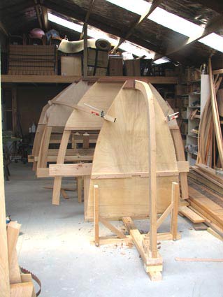 I repaint my light blue worktable to eliminate the beam offsets and curves, and start laying out the frame. Four days later, a bulkhead of 12mm plywood and 20mm kauri doublers for the framework stands against the wall. I’m well and duly framed.