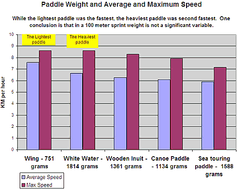She also said that for a 100 meter sprint the length, weight nor the size of the blade of the paddle made a difference in the average or maximum speed. The design of the paddle was the only difference. The Wing paddle with its modern airplane-shaped blade caught the water and made the boat go faster. The White water paddle that was second fastest has a big blade and is very strong and heavy.