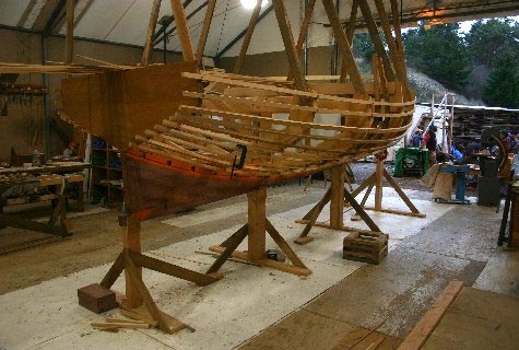 The 1935 two-masted Atkins canoe is going to be painted next week. After that's done, it's deck framing and internals will be installed.