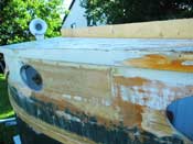 I did draw lines on the hull after initial fitting, though, so I could drill pilot holes from the outside of the boat. That way I couldn’t miss the wale. Once the glue cured, I removed the old wales. This is easiest if you cut a lot of kerfs with a circular saw and chisel out the waste. Be sure to cut a LOT of kerfs, though, or the wales’ grain can split right down into the plywood. I had to fill a couple holes because I got lazy with this. The belt sander takes off the last bit, down to clean wood.