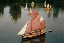 Rex has built the model plank on frame, timbers used being Kauri and Ash ply, the main sails controlled by winch arms, the fore sails static set. Being quite bluff in the bow the Belle Orlean seen in the first two photos above is not a fast boat but looks good on the water, particularly in a good breeze. He is seen with another of his boats in the third photograph, that one a ketch 850mm or 30” in length called Marlene built on a fiberglass hull to which the deck was replaced with a wood planked one, and kauri and mahogany cabins. A good little boat for windling that!