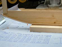To form the backbone of the model, I lofted the rabbet and chine lines onto a piece of scrap paneling which was fastened to a scrapwood base. I cut notches in the paneling to accommodate the stem and mold; the transom angle was cut into the stern end. In cutting out this backbone I made a pretty serious mistake. To avoid planking difficulties (read “staving”), I decided to eschew the deep traditional forefoot on the plans in favor of a keel that curved up to meet the chines at the bow in the manner of the “modified sharpie” at the top of p. 13 in Ted Brewer’s Understanding Boat Design. The mistake was that I drew the new keel line with a French curve rather than a batten. It looked OK as a pencil line, but when I attached a piece of balsa to it to give me a ledge to attach planking to, I could easily see that it wasn’t at all fair. The first photo below shows the stem, mold and transom attached to the backbone; the second shows the unfair line.