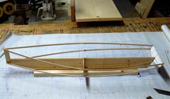 The next photo shows the frames on the strongback. On the right you can also just barely see the stem, installed on an extension whose dimensions are given on the plans. Frames were installed with half-inch, 19-gauge nails through pre-drilled holes in the cross pieces, not glued. This part is a real test for the fumble-fingered; I had more success pushing the nails into place with needle-nose pliers than with hammering., which tends to knock the blocks loose from the strongback. A notched backer stick big enough to get a good grip on (not shown) kept me from knocking the whole model on the floor while I was forcing the nails in.