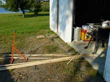 16-foot pieces are obviously not long enough to serve as chines and gunwales on an 18-foot boat, so I needed to do some joining to make pieces about 20 feet long. Following this project’s goal of simple construction, I settled on a simple butt joint, reinforced with three layers of fiberglass tape in epoxy, to add an extra four feet of material to each stick. The first tape strip, next to the wood, was about ten inches long. Each subsequent strip was about four inches longer. The surface of the wood was dished slightly with a belt sander before assembly, so the joint wouldn’t be too lumpy.