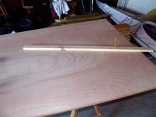 The first step was to mark and cut out the two plywood stem halves. I made a rudimentary compass out of a stick with a hole in one end for a nail and two holes in the other end four inches apart and big enough to accommodate a pencil.