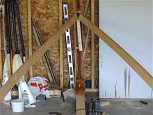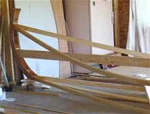 Next the halves were pulled apart and the wedges buttered with Titebond III and driven into place. If you’ve ever tried to hang a multi-hinged door that’s warped enough so that the hinges don’t line up right, you’ll know that the plywood doesn’t want to be forced into this shape. I’m convinced that the “torturing” of the plywood this way actually makes the resulting structure stronger, but it makes for some interesting assembly quirks--like one little wooden wedge being spit out and flung across the room. while you’re trying to get the next one into place. Wear safety glasses and be prepared to duck, and drill some holes in the plywood where the wedges are going to go, for temporary screws or nails to hold them in place while the glue dries. You can just barely see the nails in this photo. |