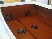 Then it was time for painting--red acrylic porch paint inside and satin acrylic house paint outside. Here’s what the aft end of the cockpit looked like after one coat. Note the extra thickness of plywood in front of the bulkhead to support the gas tank and battery, and also the clear deck plates for access to the floatation bladder behind the bulkhead and for off-season ventilation both of that space and the one between the floor and the outer hull.