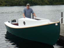 The motor is a 9.8 hp electric start Tohatsu 4-stroke. One of my initial design considerations had been a low power requirement--hence the hull shape only slightly modified from that of an old sailing skiff. I wasn’t sure just how low I could go, though, and considered everything from an electric trolling motor up to 20 hp. I chose the 9.8 due to a combination of circumstances. One was weight. I knew I wanted a four-stroke, and I knew I wanted electric start not so much for starting as for the larger alternator. The Tohatsu 9.8 with electric start weighs 90 pounds or so, which is about all I can handle by myself. More power (or equivalent 4-stroke power from other manufacturers) would weigh more. The other factor was that our local Tohatsu dealer (Moose Island Marine in Eastport) had a leftover 9.8 from the previous model year at a substantial discount, which allowed me to buy from an actual dealer with real service facilities for the same price the Internet dealers from god-knows-where were charging. Seemed like a bargain to me. Here’s the boat with motor installed on its way to the water for the first time. |
