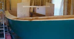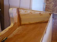 With the bulkheads in place, the next step was to install the front and side decks. Cutting the deck beams was one of the tedious jobs: There were a lot of them, and each pair required different compound angles to accommodate the horizontal and vertical curvature of the gunwales. I finally got them all right, but not before crafting a sizable collection of interesting yellow pine kindling sticks. The photo shows a carline being glued into place. I ripped these long, slender timbers out of some old redwood boards that had sat on a shelf in my shop for years, ever since I’d removed them--they’d been used as floorboards--in the course of rebuilding my baidarka. Never throw anything away.