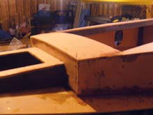 Next came another messy part: glassing all the top surfaces and the seams where vertical surfaces met horizontal ones. I used a lot of fiberglass scraps here instead of cutting nice long strips out of new material. The result is perfectly functional from a watertightness perspective, but it was a real pain in the butt to sand.