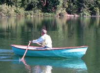 I sent Nick out by himself first to get some photos of the balance of the hull with one person, and saw that the boat sat level in the water, and where my scale weight indicated the single person rowing position should be. It took a while to get him to come back so Edie could go out with him.